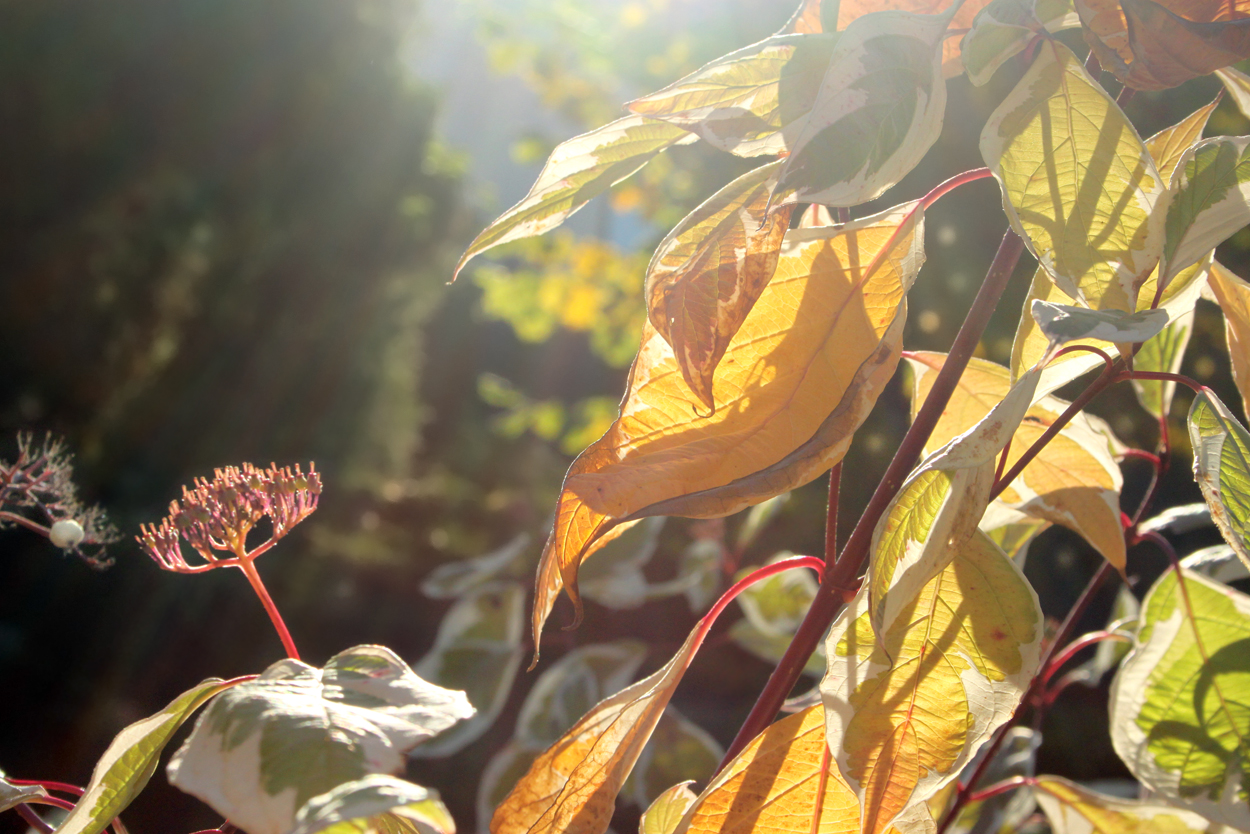 October sun through blood-red twigged Dogwood (Cornus alba)