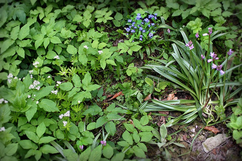 Ground Elder, Sweet Woodruff, Forget-me-not and Hyacinths