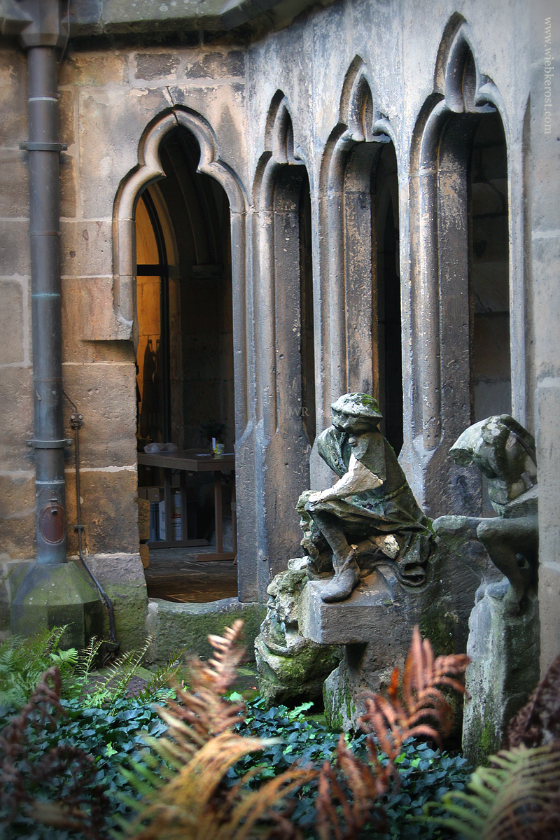 Cloister, belonging to the Dome of Meißen; there hardly gets any sunlight into the yard, which is covered in ivy and fern. Strange figurines carved into sandstone watch from the side. It’s a beautiful mysterious place…