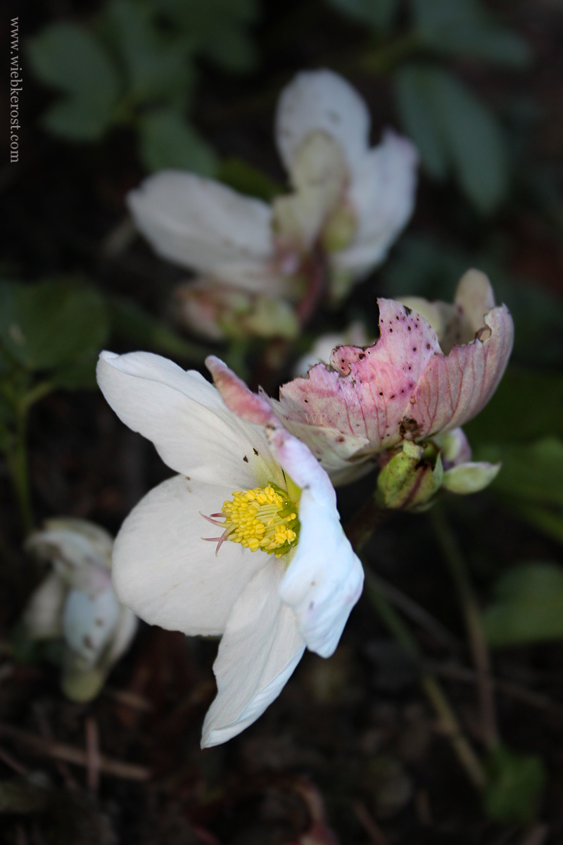 A christmas rose (Helleborus niger) with purple tinted stems and flowers, popped up in our garden