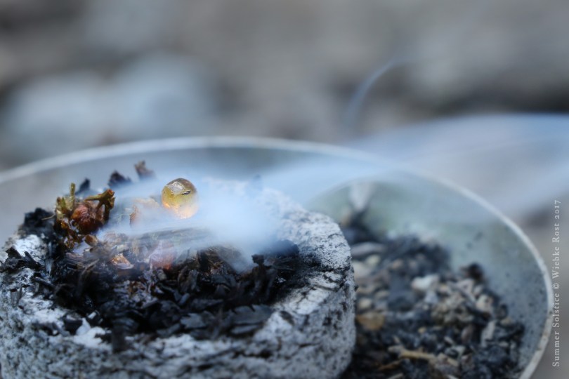 Summer solstice incense burnt at 6:24 am on the morning of Wednesday, June 21. This time marked the astronomical beginning of summer. I got up with the birds, enjoying the sunrise and blessing the new herb beds. Bees were going wild on the poppy flowers, which opened this morning…