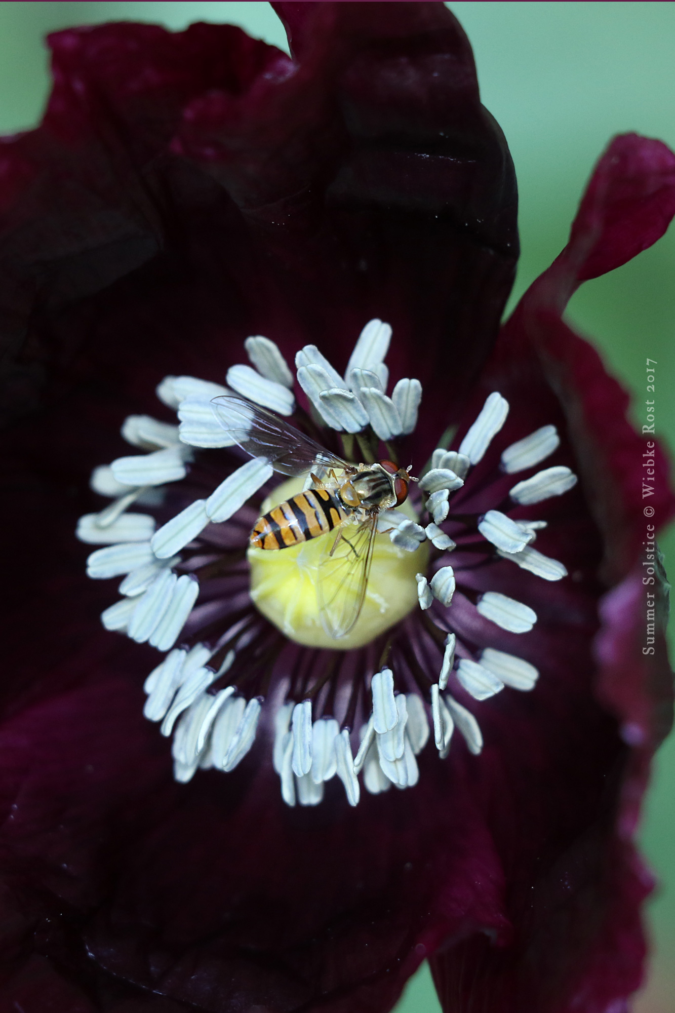 Hover flies mimic the look of other, more dangerous insects to confuse predators. It seems to work also when in competition for newly opened flowers, such as this lovely dark colored poppy.