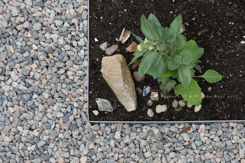 White henbane planted in one corner of the new flower patch, accompanied by ceramic and glass shards, bone pieces and various stones found when digging up the ground beneath.