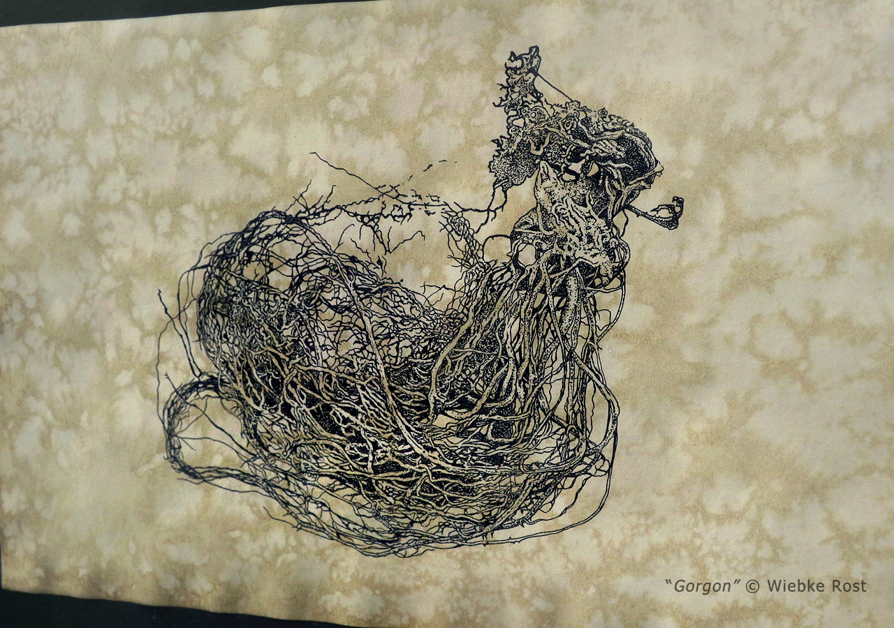 “Gorgon”, ink on coffee, wormwood and aconite