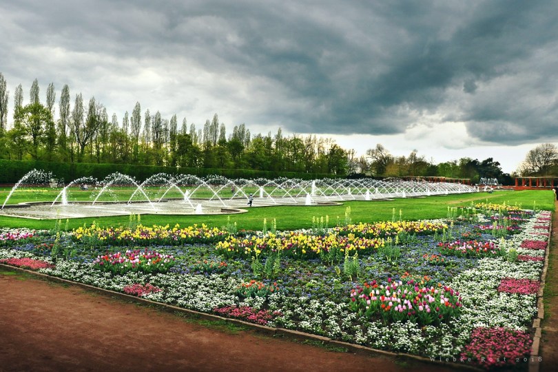 Dramatische Wolken über den Rabatten und Springbrunnen im Düsseldorfer Nordpark, Apr. ’18