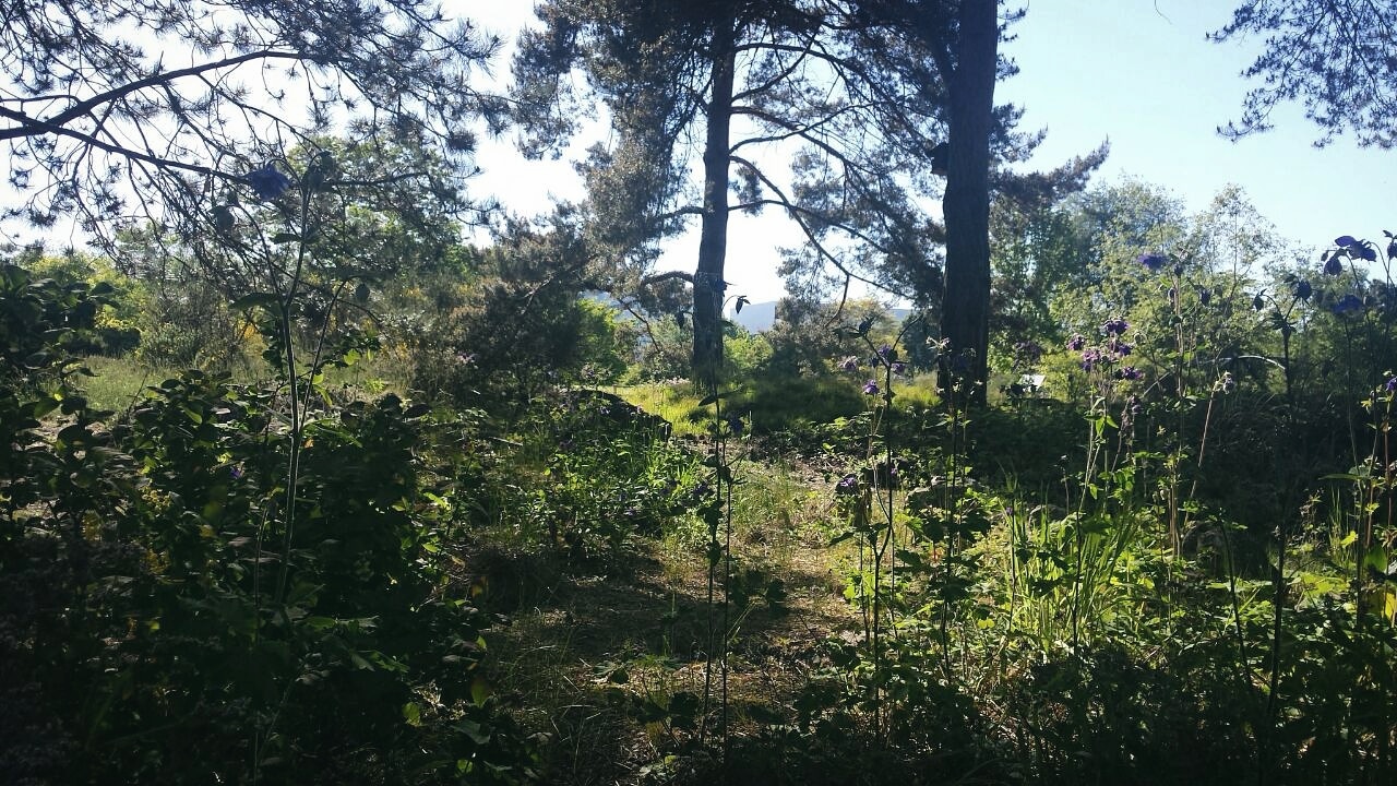 Heath landscape, with columbines and pines, at Botanischer Garten Düsseldorf