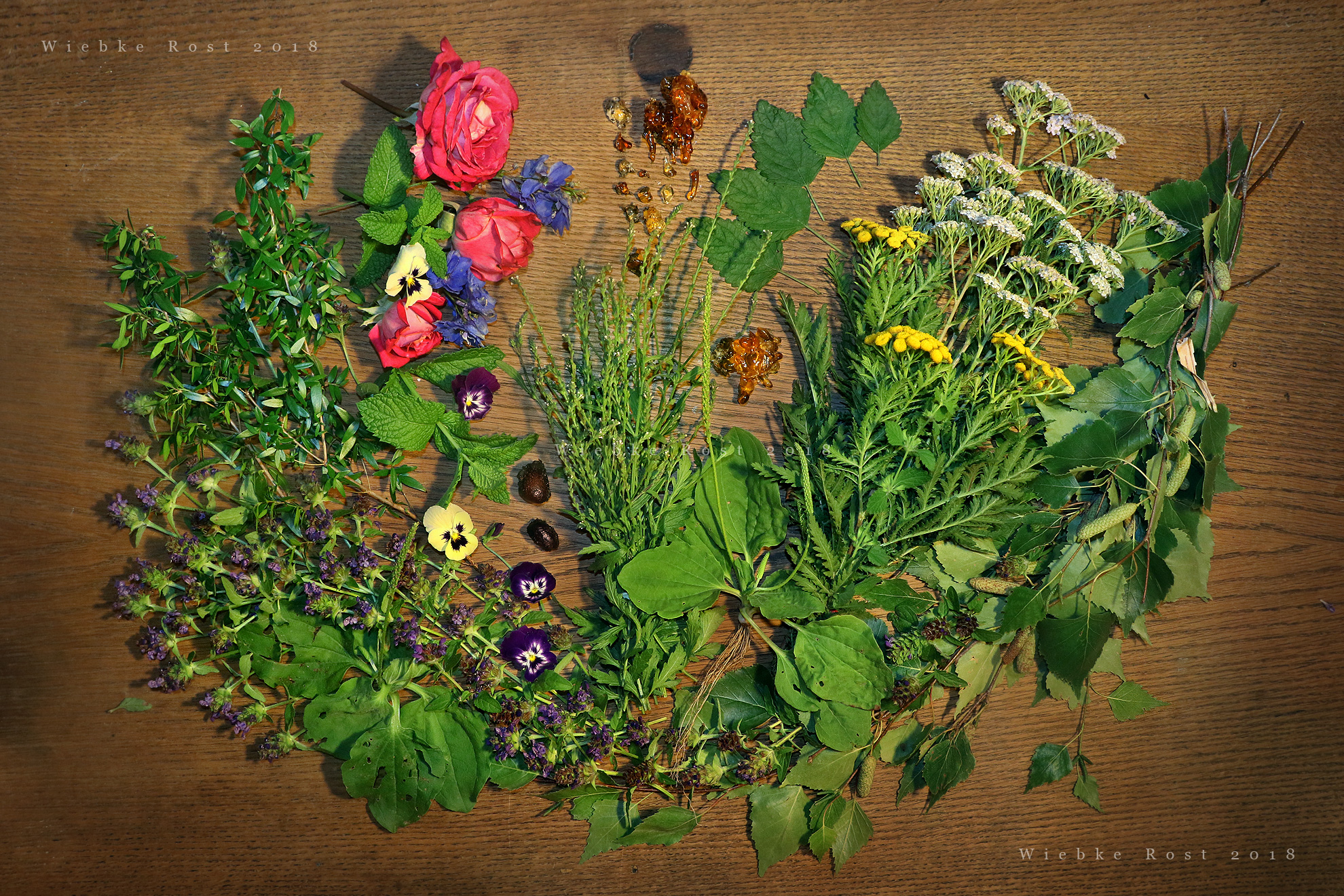 Flowers and herbs associated with the planet Venus: Myrtle, Self-heal, Rose, Larkspur, Mint, Lemon Balm, Heartsease, Vervain, Plantain, Tansy, Yarrow, Birch, Cherry resin