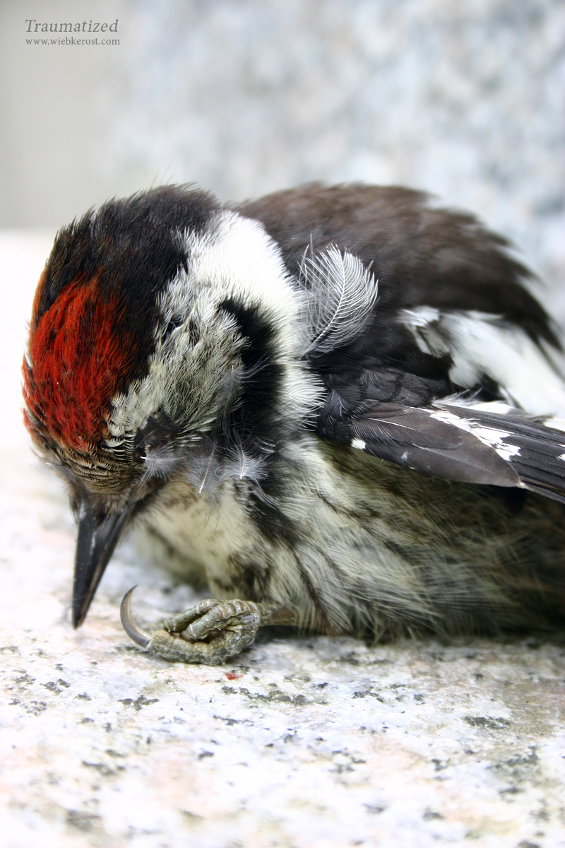Spotted Woodpecker, probably hit against glass or drunk from eating fermented berries… the bird recovered and flew aaway about an hour after I had found it on our stairs