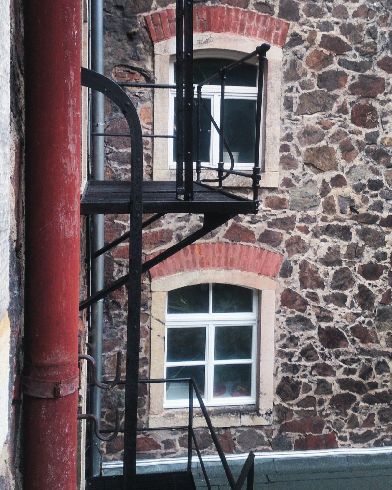 The fire escape beside my office-atelier window. I like the view with the thick old walls.