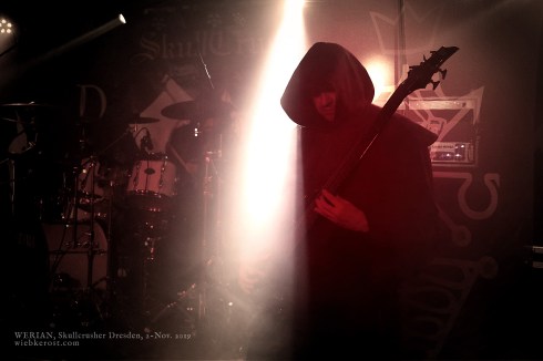 Vorab, als gebürtige Dresdnerin, die die meiste Zeit ihres Leben hier verbracht hat, aber oft ausgeschwärmt ist, um all die tollen Bands da draußen mal live zu erleben, waren diese Heimkehr und das Line-up an diesem Abend ein echtes Highlight. Was die Veranstaltung für mich noch besonderer machte, war die Tatsache, mit WERIAN zum ersten Mal eine Band fotografieren zu können, die gleichzeitig auch meine Illustrationen auf der Bühne als Stage Art verwendet. Zudem muss ich für den Skullcrusher eine Lanze brechen: es wurde vorab bestens über die Veranstaltung und den Ablauf informiert, und es gab an der Abendkasse tatsächlich noch Karten. So kamen zwei gute Freunde auch noch problemlos rein. Und zu guter letzt konnte ich, im letzten Jahr auf der Samhain Celebration in Gotha geknüpfte, Freundschaften aufwärmen. Der Skullcrusher fuhr zwar kein derartiges künstlerisches Begleitprogramm auf (diesbezüglich sind ein Event, wie das in Gotha oder die Veranstaltungen der “Funkenflug Society” in Österreich, wohl tatsächlich unvergleichlich). Dafür lag der Fokus ganz und gar auf den Bands. Und die lieferten.