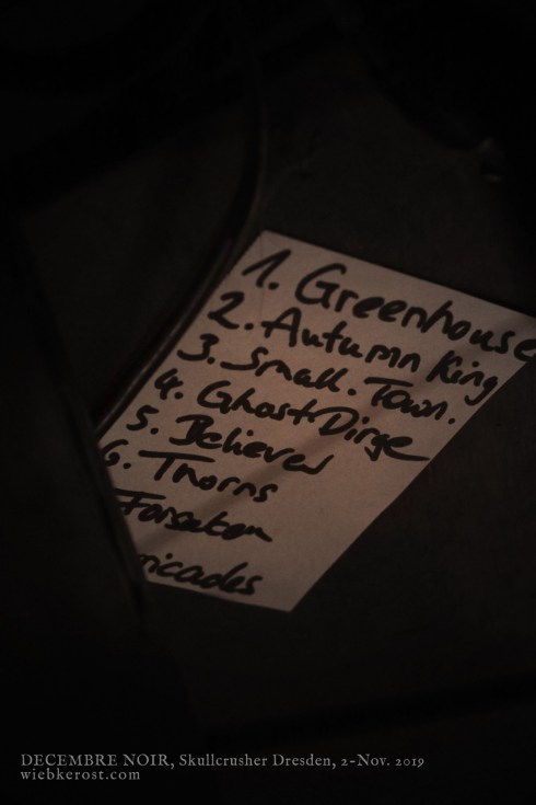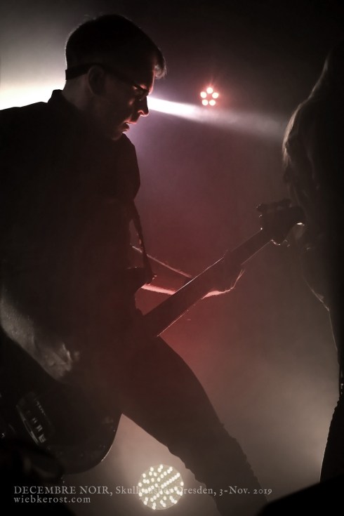 Düster, schleppend und mit tiefen Growls präsentieren die fünf Mitglieder von DECEMBRE NOIR eine deftige aber auch eingängige Kombination aus Death und Doom Metal. Die Setlist entnehmt ihr bitte den Fotos. Als ich diese nun noch einmal durchhöre, stelle ich fest, dass zu den meisten live gespielten Titeln auch professionelle Musik-Videos existieren, die ich ästhetisch durchaus ansprechend aber thematisch als etwas klischeehaft empfinde. Live dargeboten, machen die Songs dagegen durchaus Druck. Der Saal ist inzwischen auch bis in die hinteren Reihen gefüllt und in den vorderen wird von “In This Greenhouse Of Loneliness And Clouds” bis “Barricades” mitgebangt. Ein insgesamt kompakter und souveräner Auftritt, an dem es wenig zu kritteln gibt. Allein, dass mich DEKADENT dann doch einen Hauch mehr fasziniert haben.