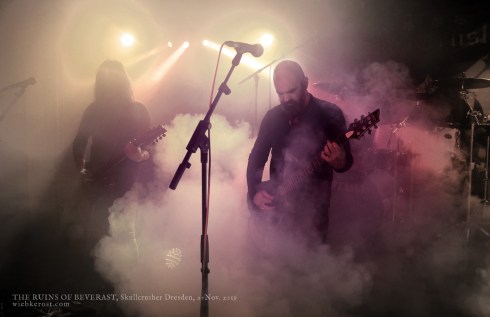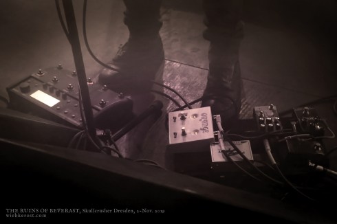 Einige Passagen erinnern mich irgendwie an alte SAMAEL und andere morbide Engel (vermutlich bei “Kain’s Countenance Fell”), oder auch an die epischen Kompositionen PRIMORDIALS in ihren besten Zeiten. Desweiteren greifen THE RUINS das schamanische Thema wieder auf, mit welchem WERIAN den Abend eingeleitet haben. So schließt sich der Kreis an diesem Abend. THE RUINS erschaffen eine mehrere Ebenen umspannende Klanggestalt, die unglaublich finster, kalt und doch warm zugleich erscheint. Und zwar live wie auf Platte. Umso erstaunlicher, dass all dies aus der Feder eines einzelnen stammt und live von Session-Musikern dargeboten wird.