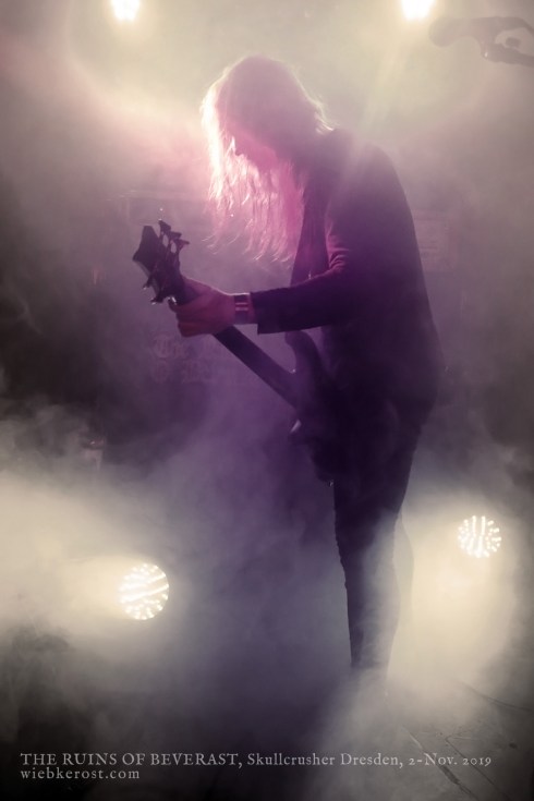 Genug des Vorgeplänkels. Es geht los. Ich muss mich ein wenig unhöflich vorzwängen, um eine halbwegs gute Position zum Fotografieren einnehmen zu können. Denn der Saal ist nun randvoll gefüllt (wenn auch nicht erdrückend) und vorn bin ich nicht die einzige mit der Absicht ein paar nette Konzertfotos zu machen. Ich versuche aber, mich zu bremsen. Blitzlicht ist eh tabu. Und es wird auch bei den RUINS genebelt was die Maschine hergibt. Ob der fortgeschrittenen Stunde ist meine Konzentrationsfähigkeit auch nicht mehr die beste. Also lasse ich mich jetzt auch einfach mal treiben…