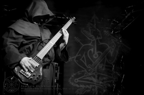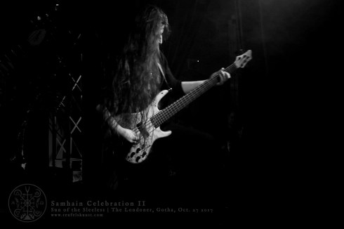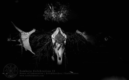 Zeit für eine Pause an der frischen Novemberluft. Um und vor der Treppe zum Club tummeln sich inzwischen um die 200 Leute und genießen mit Bier und/oder einem Fischbrötchen vom Imbisstand draußen, die Zeit bis zum nächsten Act. Hier treffe ich auch die zwei sympathischen Besucher aus dem Erzgebirge wieder, die ich bei der letzten Samhain Celebration kennenlernen durfte. O-Ton Sören: “Wiebke, dass du noch mal einen solchen Bierbauch bekommen würdest!” Mit meinem SHAARIMOTH Longsleeve versuche ich eben jenes Bäuchlein warm zu halten, fühle mich allerdings ein bisschen underdressed, zwischen den ganzen mit Patches und Pins geschmückten Lederjacken und Kutten. Meine Ledri ist leider in Düsseldorf geblieben. An der Bar sorge ich zudem für Enttäuschung, als ich nur ein weiteres Wasser bestelle. Ich verweise auf meinen “Bierbauch” und tue so als wäre es Klarer, was wiederum für Heiterkeit sorgt. An dieser Stelle seien die extrem sozialen Getränkepreise des Skullcrushers lobend hervorgehoben! Es fehlt einem hier an nischt und gemütlisch isses och… aber zurück zur Musik.