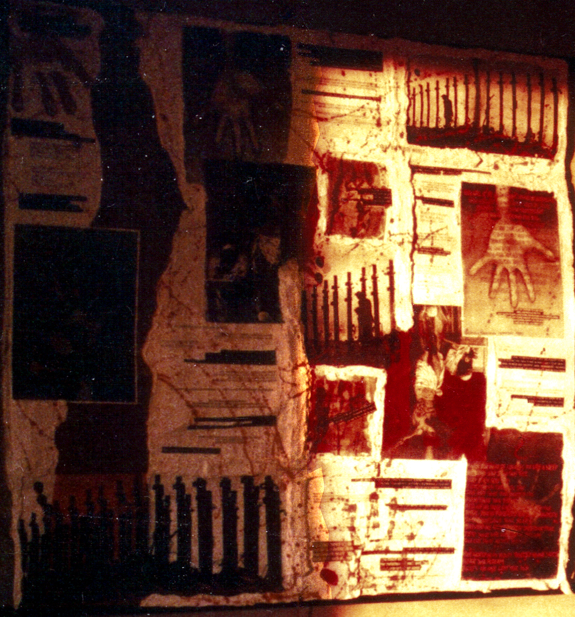 Media used: gypsum, red paint, varnish, blood, photo-copies from magazine articles, bible quotes