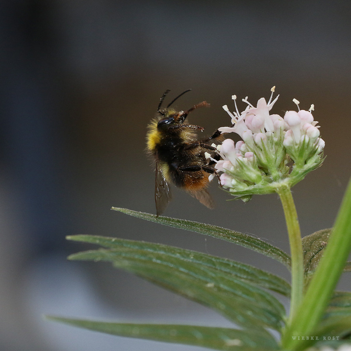 Tipsy bumblebee on valerian flower, almost falling over while cleaning itself , May 31 2017