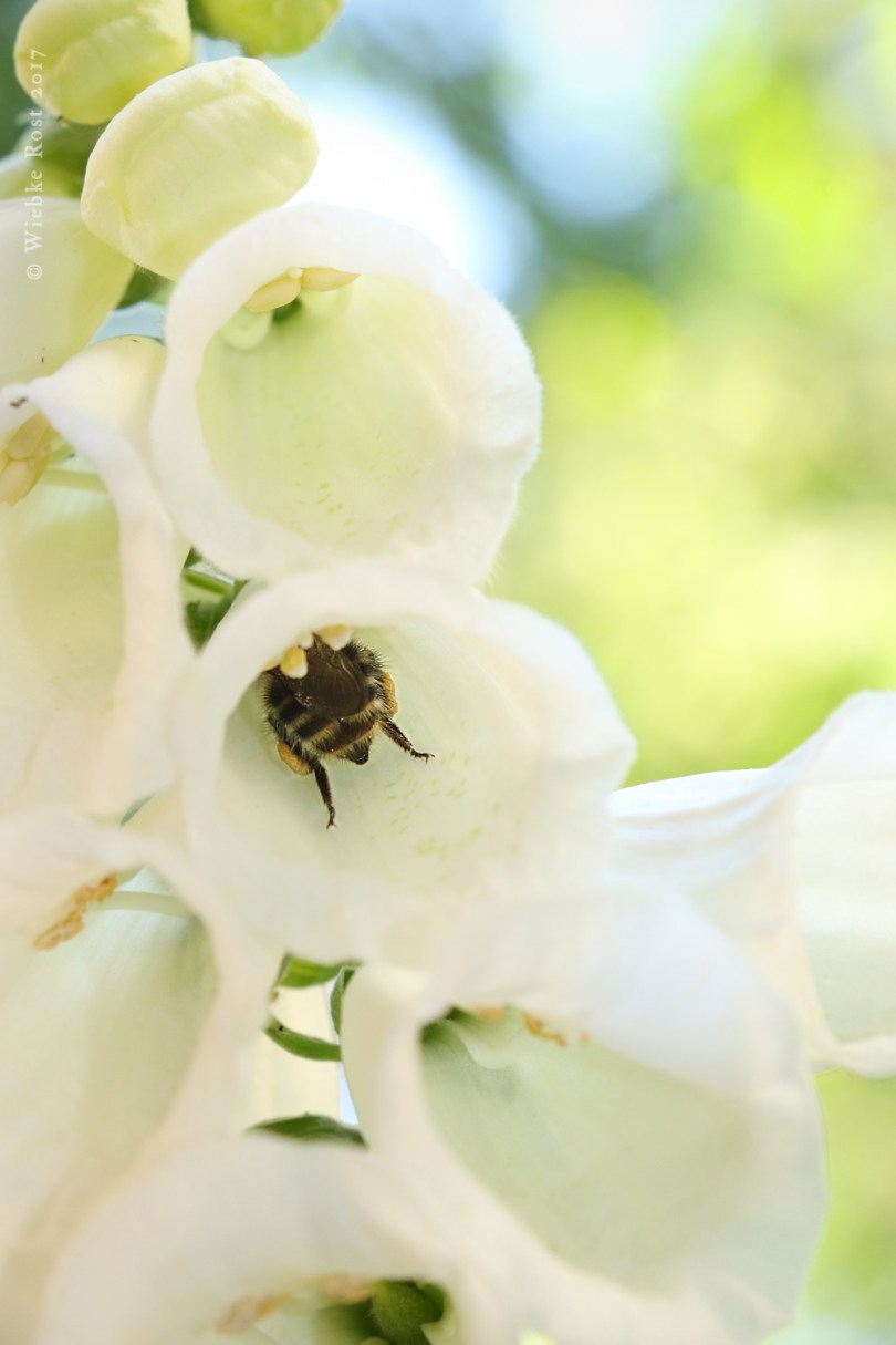 Large Bumblebee entering the flowers of a white flowering foxglove. It’s that time of the annual garden buzz concerto! When the bumblebee enters the flower it acts like a funnel, amplifying the buzzing.