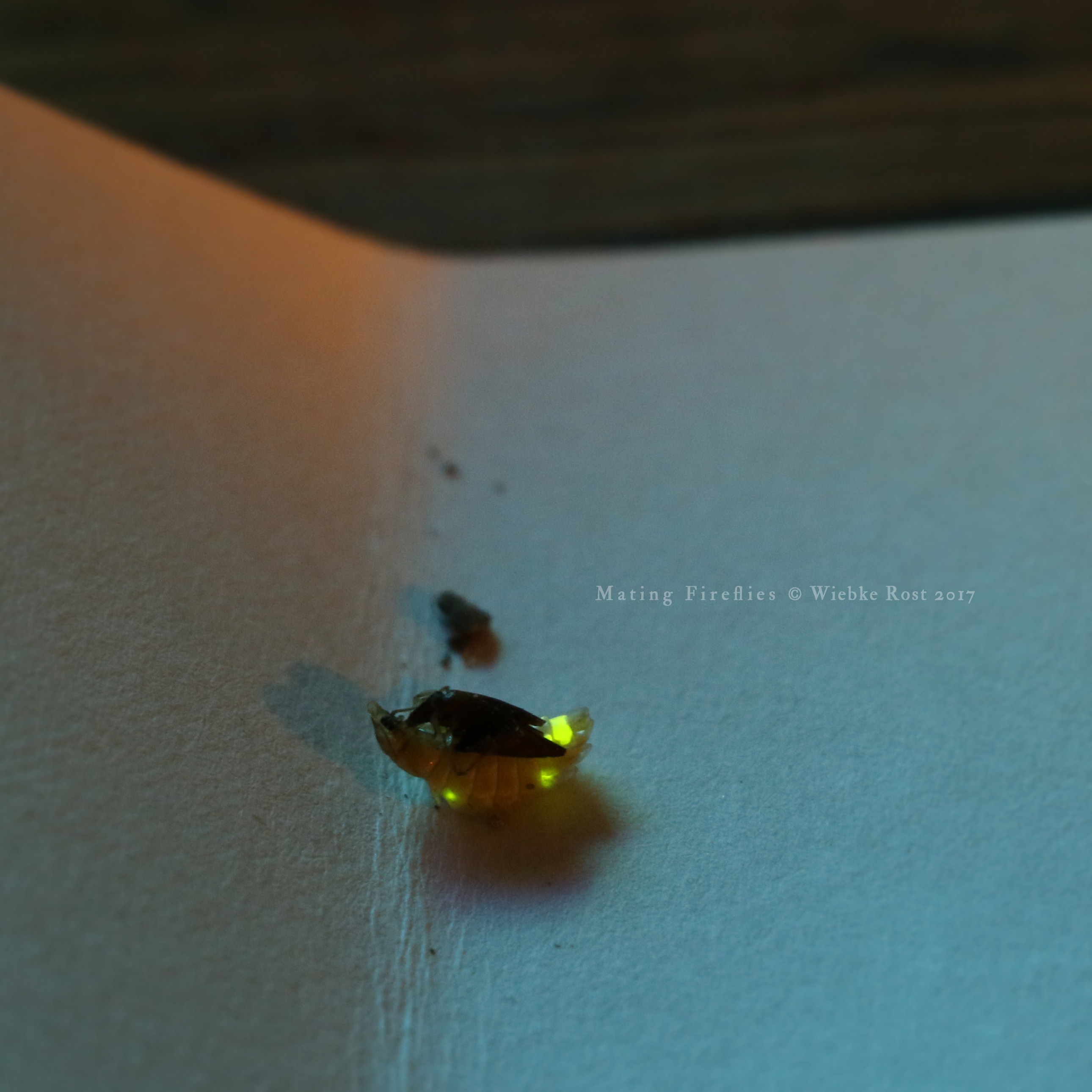 St. John’s Eve 2017: Since the summer solstice there are little fireflies dancing around our garden at dusk. Their literal heyday happens to fall between the summer solstice and Eve of St. John (24th of June), which is why they are also known as “Johanniswürmchen” in German. It is the night, when the males can bee seen “dancing” in the air in search for a female. The male fireflies are now in their last incarnation, during which they only drink water and sustain themselves from reserves gathered during previous chrysalis stages. The females in turn are not able to fly and thus attract the males by emitting light. From this may stem the English name “glow worms”. There are many different light emitting bugs to be found all across the world. But in my location the males of Lamprohiza splendidula are the only males also capable of emitting light. The males of other firefly species in my area do not emit any light. Hence it is 100% the males of Lamprohiza splendidula when seeing fireflies dancing in the air where I live. When the males have spotted a partner they descend vertically unto the female for copulation and die shortly after. I guess that’s what you call “getting laid”! Now, before you accuse me of disturbing them in their most intimate moment; I found them on our basement steps and first did not realize that it was two mating fireflies. I wanted to secure it but also was curious which species it had here and hence took this photo and then relocated the pair to a nearby flower patch. Hoping for a new and larger generation of fireflies to frequent our garden soon!