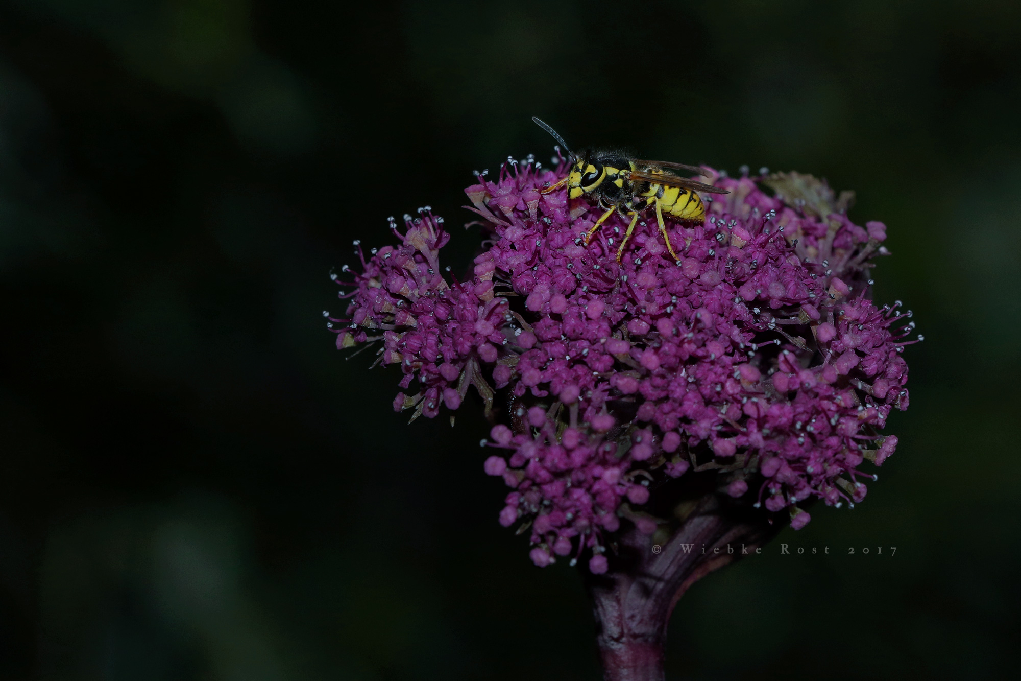 Wasps are pollinators too, yet, this is my first photo of a wasp to join the “flower devils” series. It was there this afternoon, and it was still there this evening, turning around in circles on the flower of Angelica gigas.