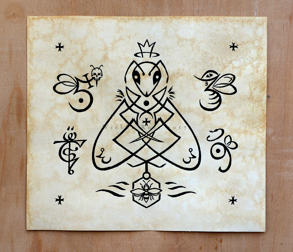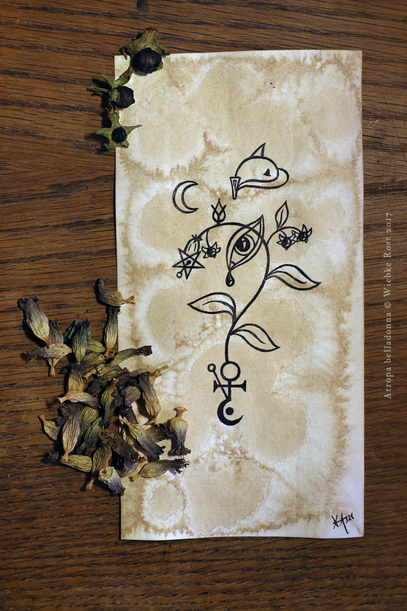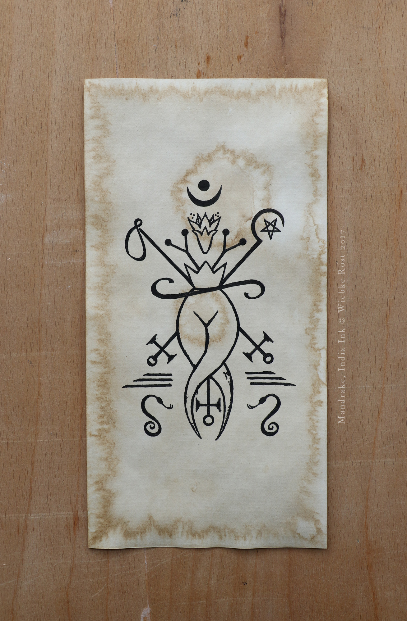 About 10 years ago I began creating abstract line drawings, or ‘sigils’, inspired by nature. In these works I summarize nature science, folklore and personal experiences connected to the plants and animals that surround me. Some of these works are already 10 years old. The best known is perhaps the official Teufelskunst logo, which is inspired by the wormwood herb. Another is my sigil for the ‘black mandrake’ and the metamorphous art titled “Regina Amandrakina”, which were both published in “Pillars Periodical, The Ebon Kteis” (Anathema Publishing, Canada, 2014).