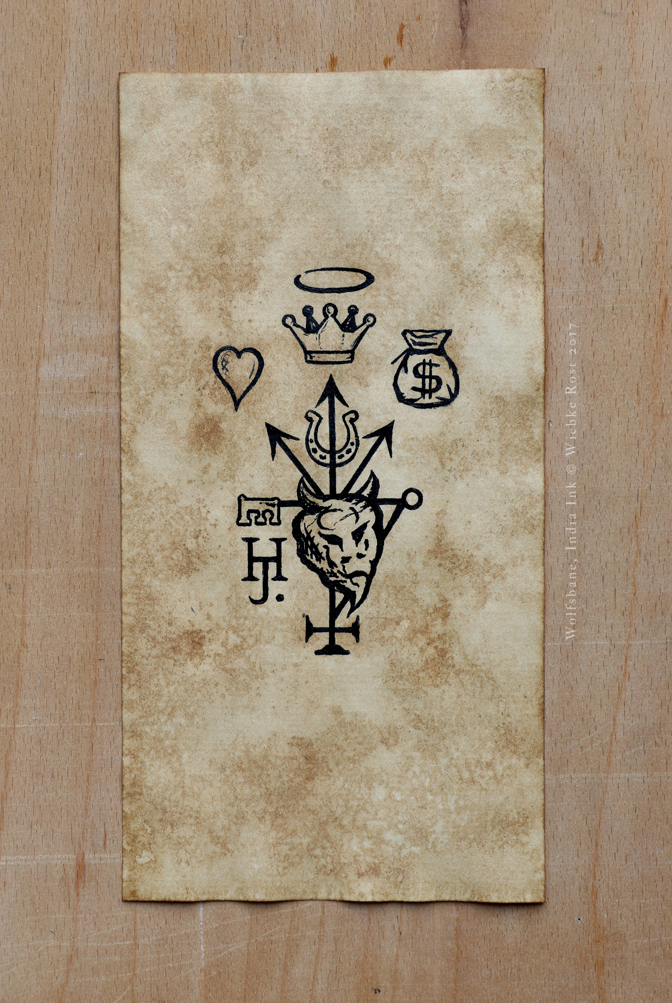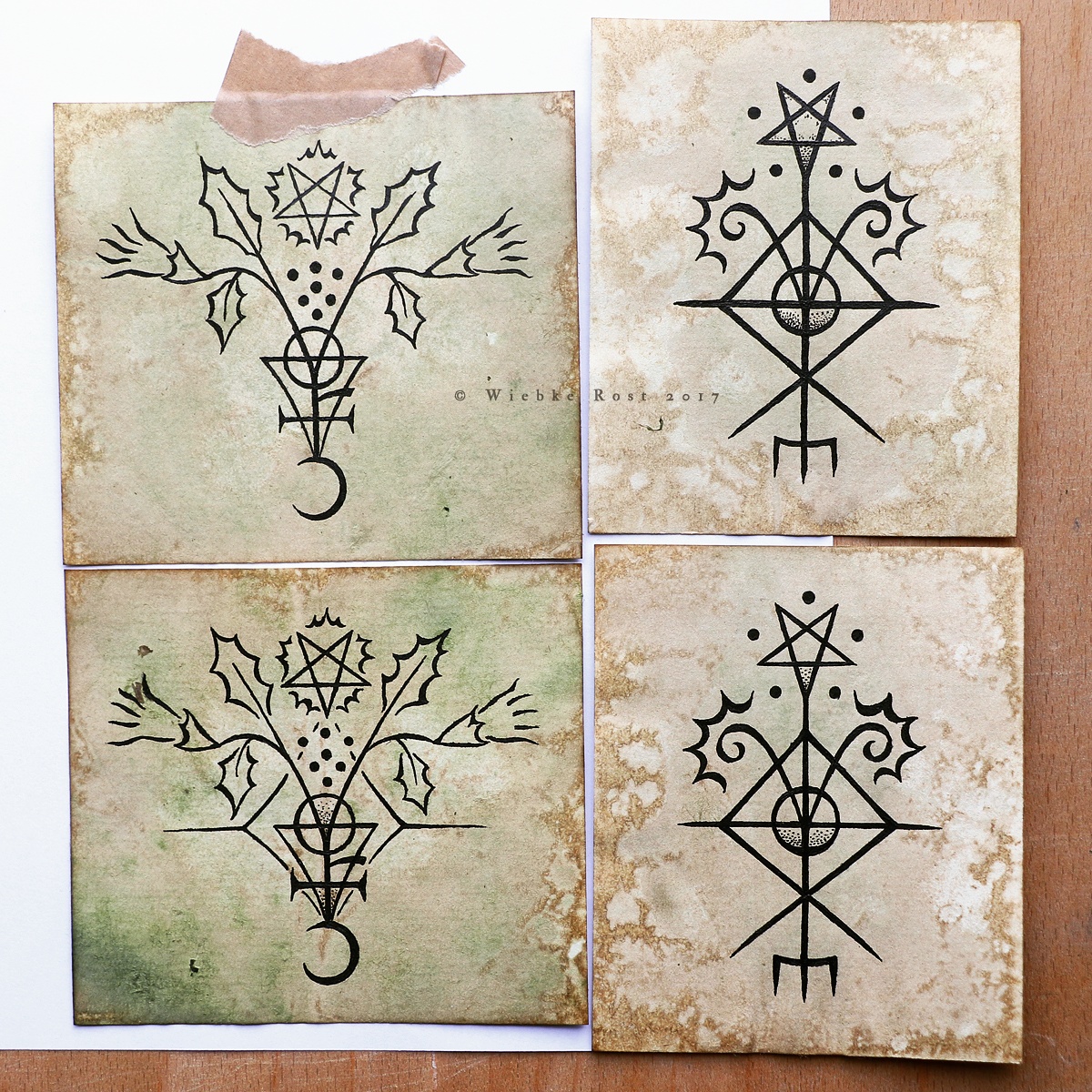 A first print edition of these works was introduced at the London “magical Art/E” event, which took place in 2014 at the old Hackney tower. Later (still self-produced) print editions sold out quickly. In follow, I created smaller ink drawings and miniature editions with these sigils. An important aspect of these drawings is the treatment of the paper, which is infused with tinctures and corresponding extracts of natural materials. In November 2017, these ink drawings premiered as part of the “Bad Intentions” group exhibition at Gallery CIRCLE1, Berlin.
