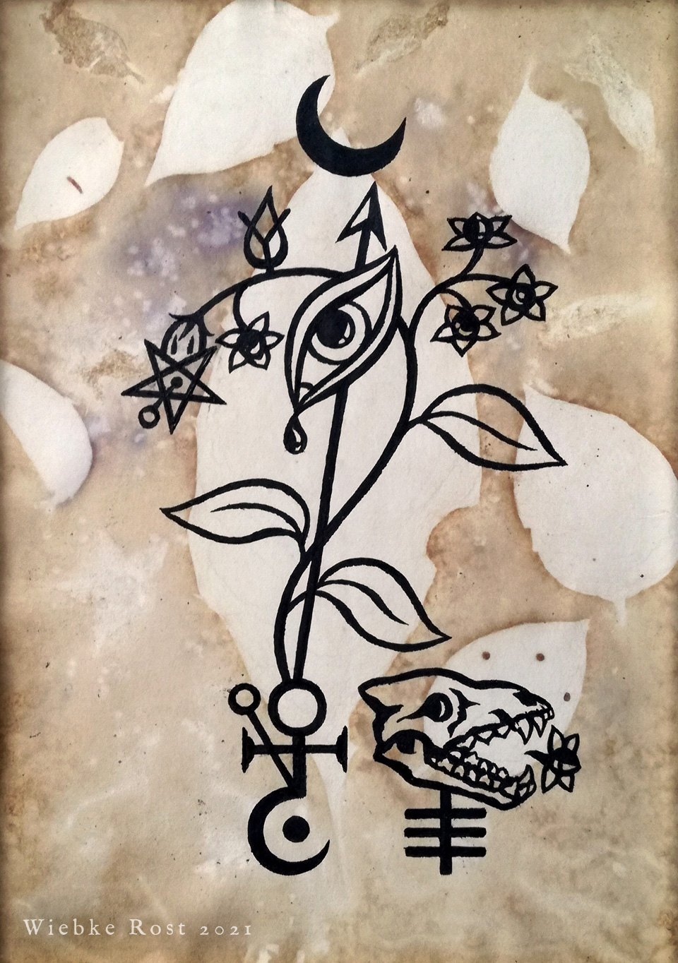 In 2021 I reworked some designs in my Sigilla Magica series. I also continued experimenting with applying plants unto paper, by placing whole plant parts on the paper and then soaking everything in coffee and plant extracts. See videos of the process on my instagram. In a final step, the new sigils were drawn with india ink on the papers. The new series was done with Black Henbane, Deadly Nightshade and High John the Conqueror root. I created three pieces of each. I am proud to say that one edition is now in the hands of a collector in Bavaria and the second one has recently been purchased by photographer and friend Cyril Helnwein in Ireland. Thanks guys for supporting my art!