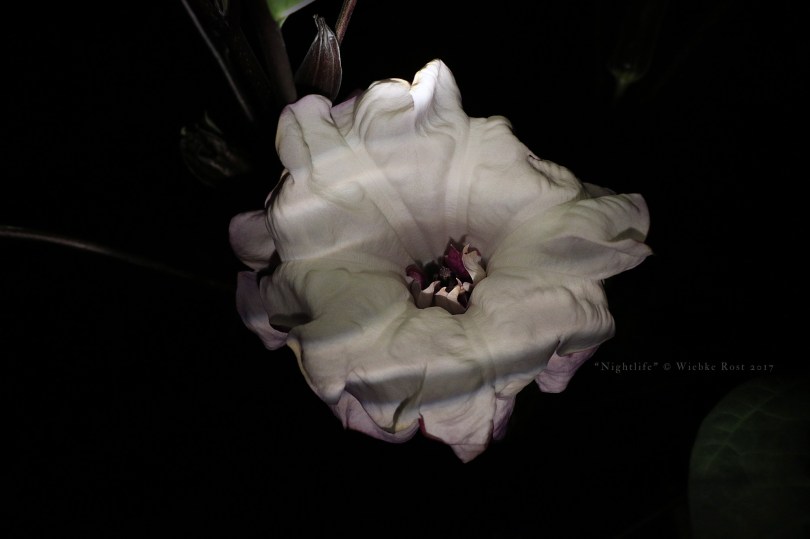 The fragrant flower of Datura metel, opens for one night. Photographed July 2017.