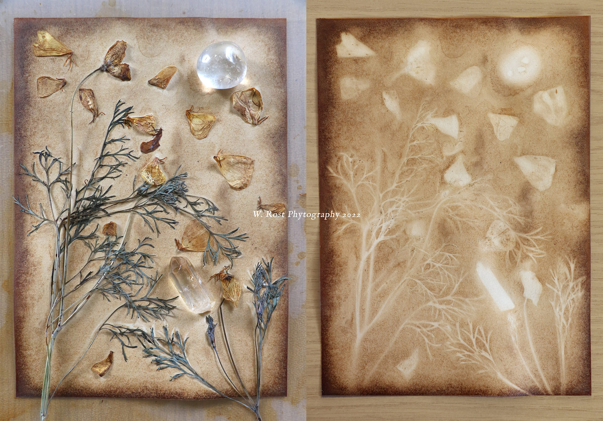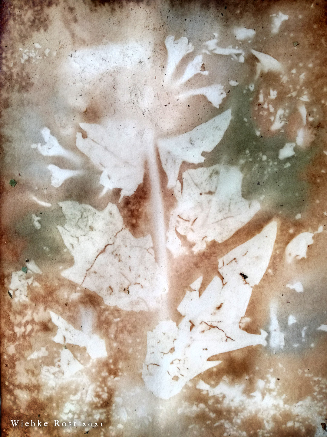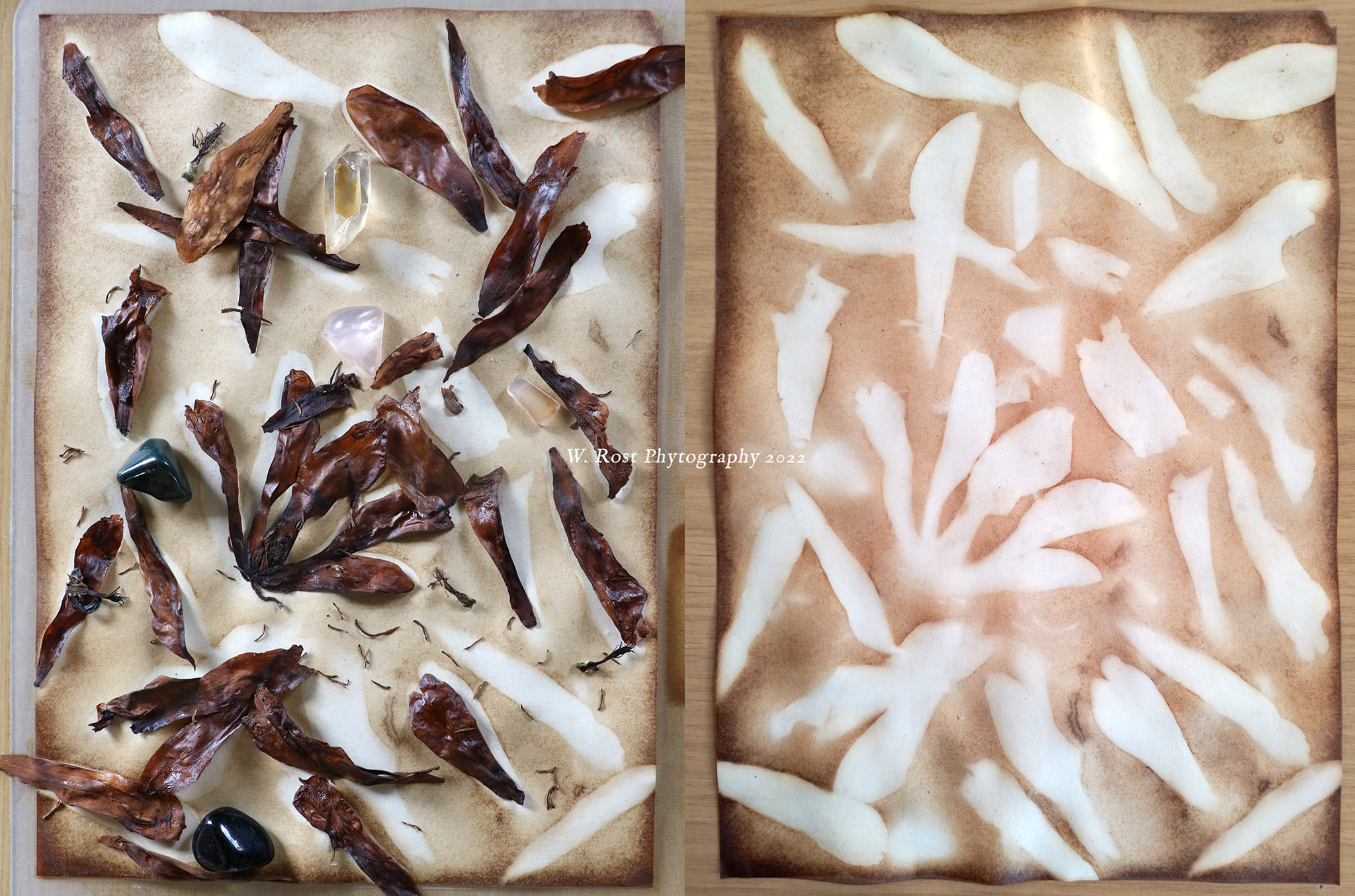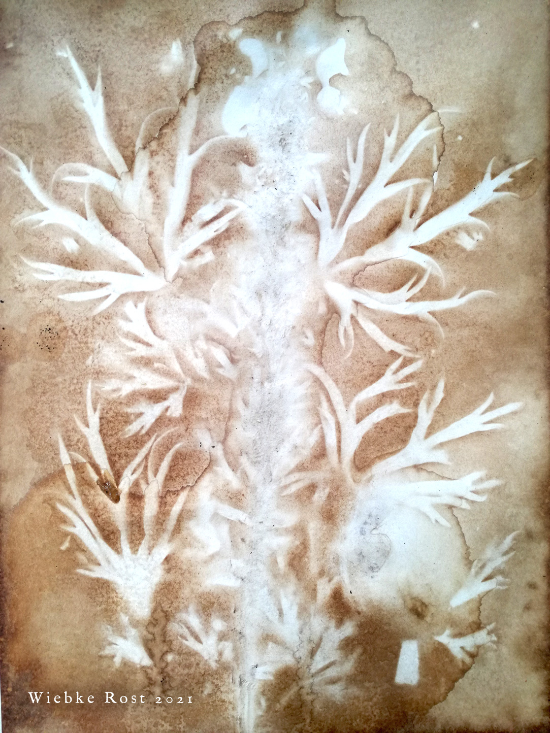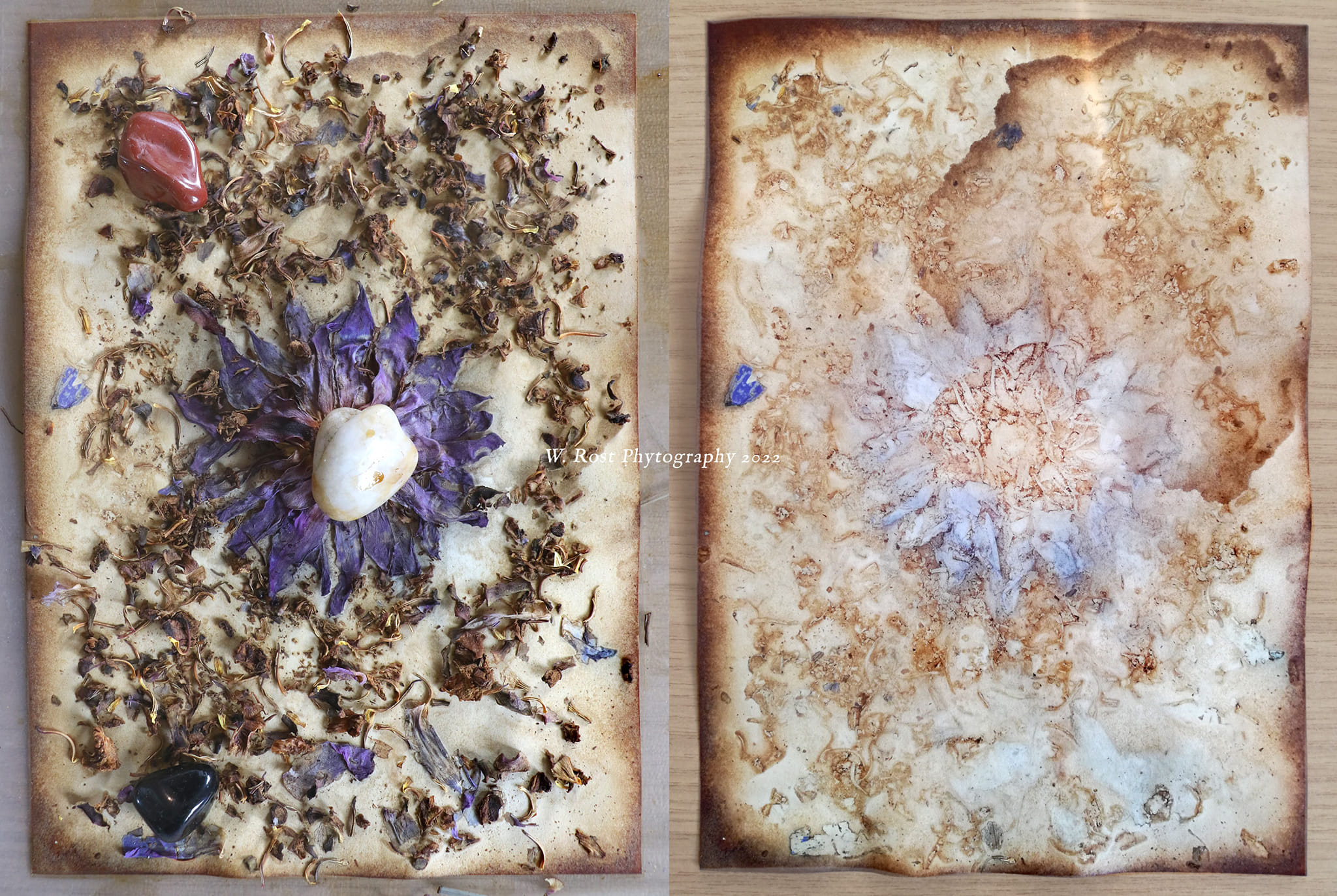 In 2021 I continued experimenting with applying plants unto paper, by placing whole plant parts on the paper and then soaking everything in coffee and plant extracts. See videos of the process on my instagram. In a final step, sigils were drawn with india ink on the papers. The new series was done with Black Henbane, Deadly Nightshade and High John the Conqueror root. Three pieces of each were created. One edition is now in the hands of a collector in Bavaria and the second one has recently been purchased by photographer Cyril Helnwein in Ireland. Cyril also owns the winter solstice ’21 “Datura ferox” phytograph.