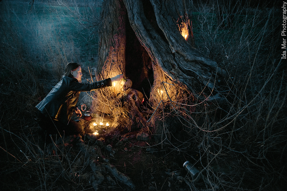 We spent the whole day preparing and set to work in the evening, as the blue hour descended. Our meeting happened to coincide with the dark of the moon. The location is an old hollow willow tree close to the river. I refrained from a complex ritual set-up and instead focused on the act itself, burning Incense of Lilith and pouring libation of self-made pomegranate vodka for the spirits of the place. Whether we nurtured invisible specters or mainly ourselves – the religious aspect of occult ritual work is part of the complex topic explored by Anne in her ongoing series “Gravis” and “Krura“.