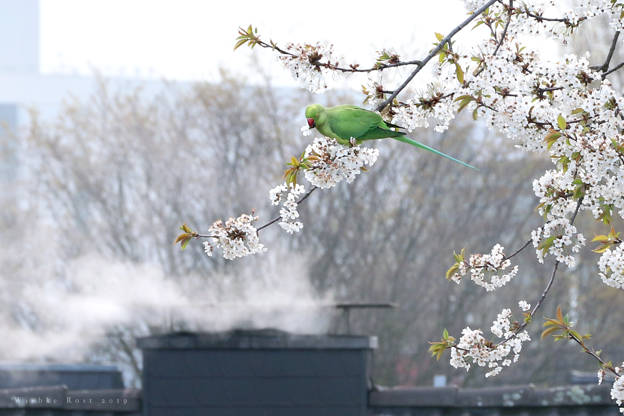 5 AprThis ring-necked parakeet is enjoying an early morning lunch by eating the flowers of the cherry tree in our yard. Ring-necked parakeets are spreading in German cities, especially in North-Rhine Westphalia and are getting into conflict with humans. E.g. Cologne began in 2018 to actively expel the birds from its city center. Meanwhile ornithologists suggest beneficial effects of the parakeets, since their breeding burrows are being reused by other birds, e.g. stock doves, which are listed as threatened. The parakeets breed earlier than our native birds. During autumn there about 3000 parakeets, crows and jackdaws gathering at Düsseldorf’s ‘Kö’.