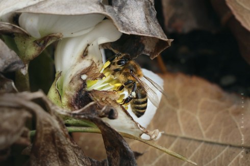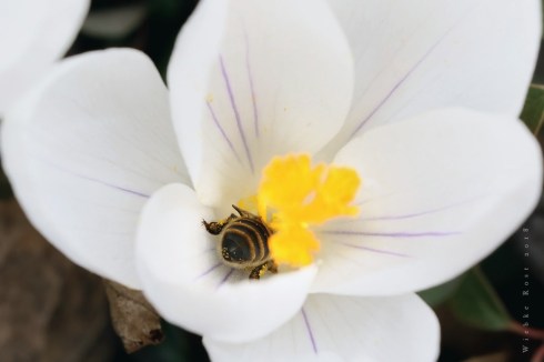 The buffet is opened: Today came to visit the first bees! Still a bit slow and clumsy from the cold, but so nice to see them back in our garden!