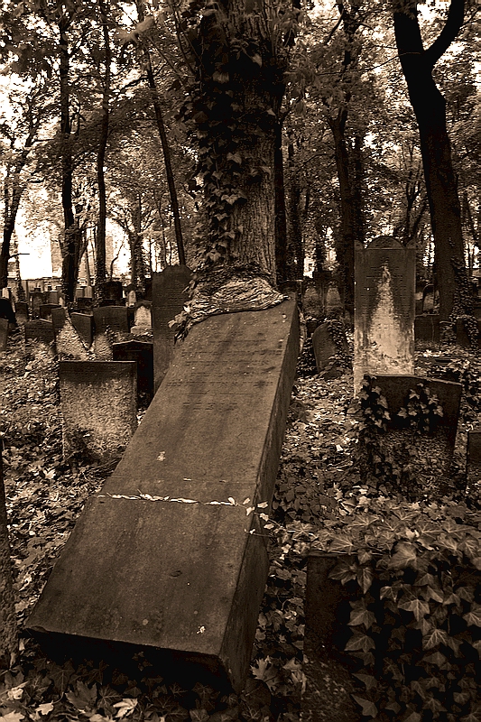 Tree “swallowing” a tombstone, Jewish cemetery, Berlin