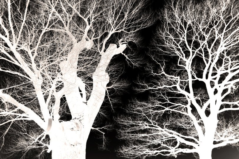 Inverted photo, showing the border between two trees; the branches remind of the dendrites of neurons.